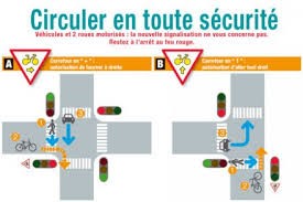 Ce panneau représentant un vélo jaune sur fond blanc avec une flèche pointant vers la droite, autorise les cyclistes à franchir le feu rouge pour tourner à droite.
